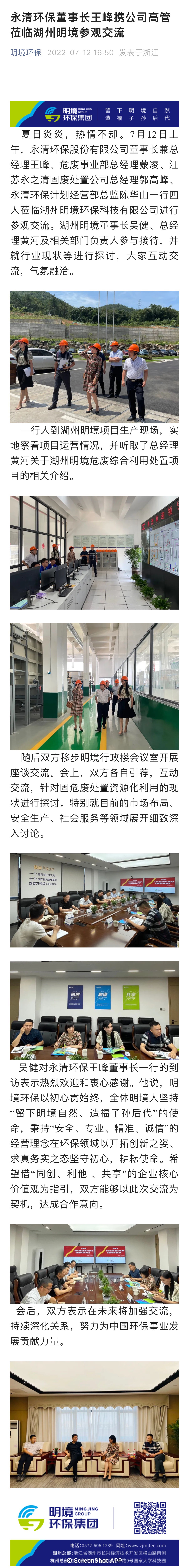 永清環(huán)保董事長王峰攜公司高管 蒞臨湖州明境參觀交流